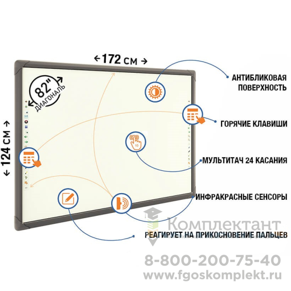 Превосходный и бюджетный интерактивный комплект, который включает в себя всё необходимое для установки и эксплуатации. Интерактивная доска реагирует на прикосновение пальцев, имеет мультитач 10 и распознаёт рукописный ввод текста.