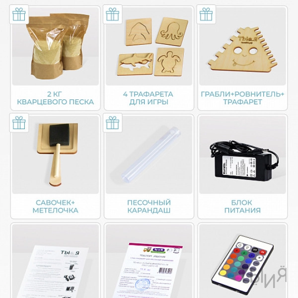 – в комплекте набор инструментов (совочек и щёточка, набор трафаретов, песочный карандаш);