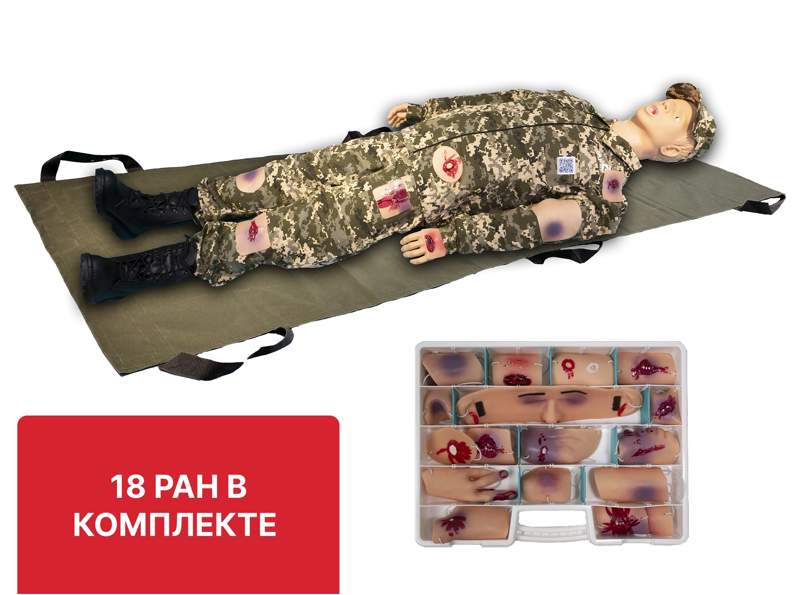 В комплект входят накладные травмы и ранения различной степени тяжести с возможностью замены и установки на любую часть тела тренажера для отработки первичных навыков оказания первой помощи.